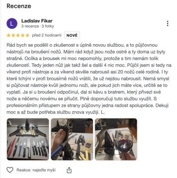 Pokud jste byli s broušením spokojeni, potěší mě, když se o svou zkušenost podělíte v hodnocení na Googlu. Hodnocení mi pomáhá služby dál zlepšovat a zároveň usnadníte rozhodování dalším zákazníkům.